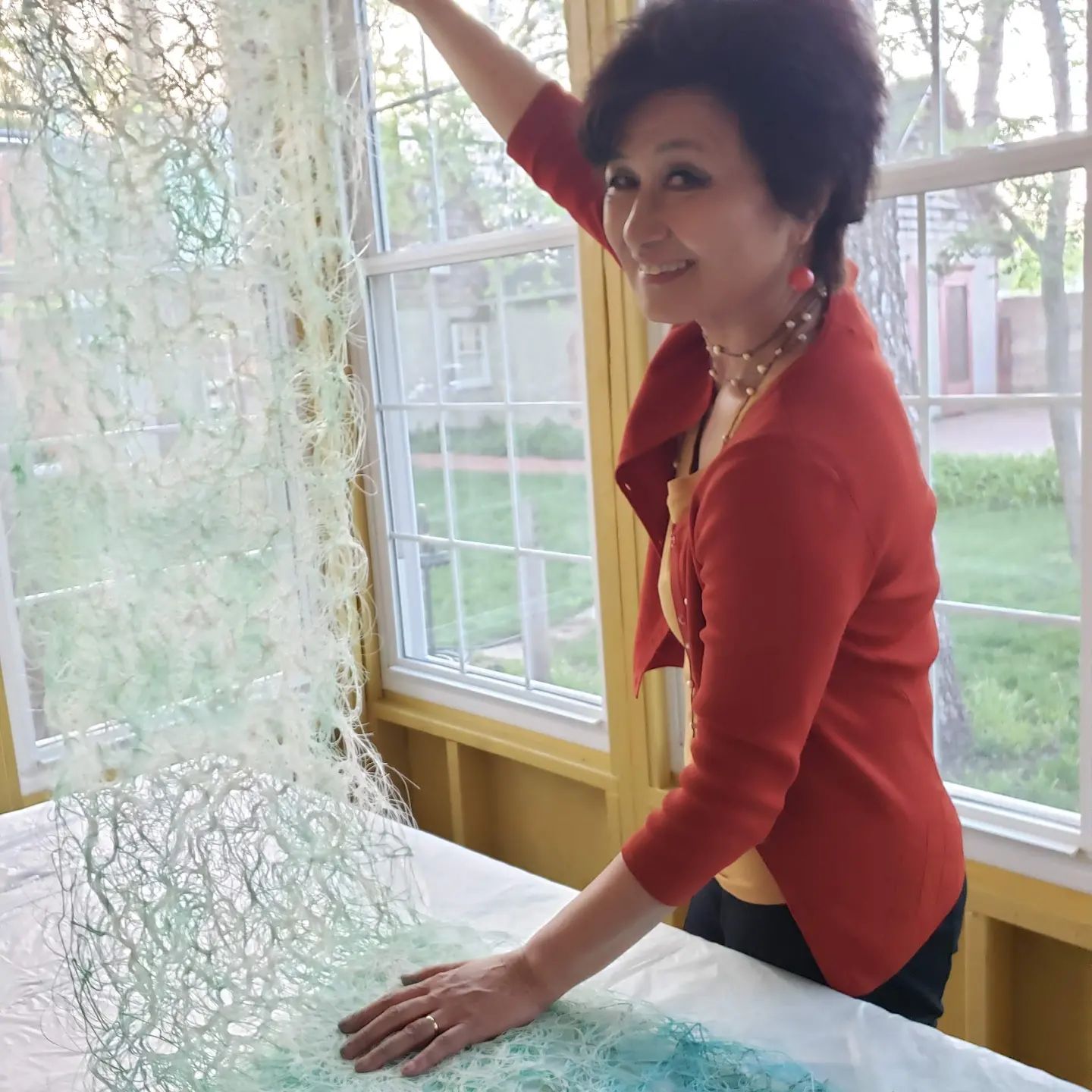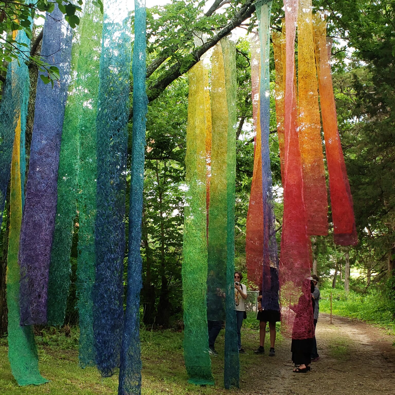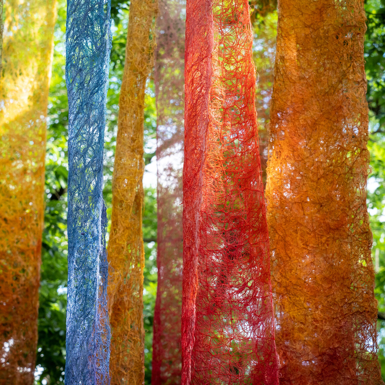 Using plastic fishing wire (monofilament) and natural fibers, I installed panels beneath tree branches to evoke a vision of harmonious coexistence. These artificial structures serve as interpreters or catchers of the wind’s voice—an element we often overlook—inviting viewers to embrace nature’s mysterious and restorative force.