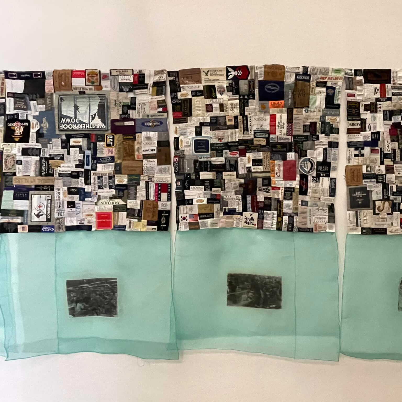 Techniques: Whip stitch, image transferThis series began in 1988, when I immigrated from Korea to the United States. Using labels from my family’s clothing, I created patchworks every two years, each composed of 150–200 labels. Over time, these works evolved into a collection of 15 patchworks, chronicling our migration, the places we lived, and the growth of our children.